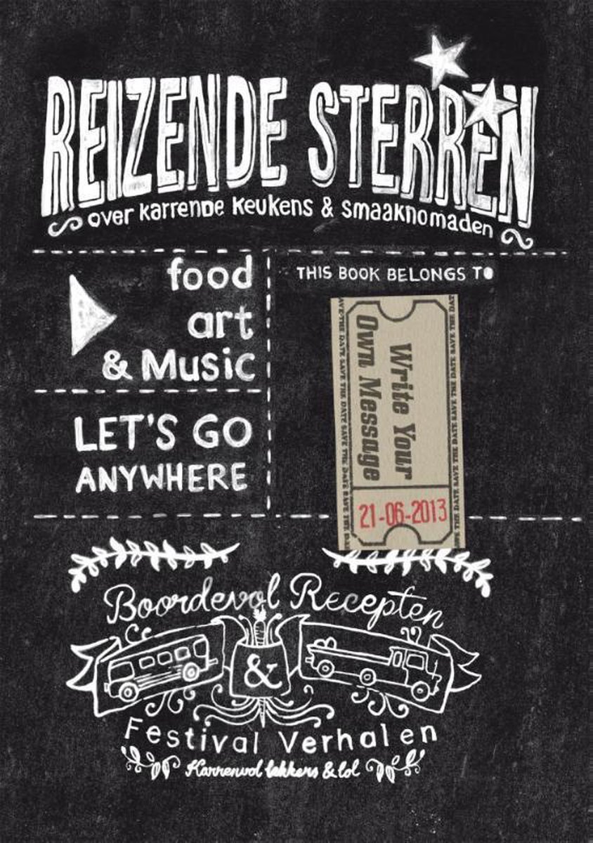 REIZENDE STERREN OVER KARRENDE KEUKENS & SMAAKNOMADEN Monica Abdoel – in samenwerking met The Food Line Up Boordevol recepten Unieke omslag van krijtbord met krijtje Nederland kent inmiddels 180 mobiele keukens. Het zijn gepassioneerde ondernemers die met hun artistieke initiatief een beeld geven van smaakvolle en verantwoorde streetfood in Nederland. Het boek is een verzamelwerk van creatieve keukens die regelmatig in het land, op culinaire events en op diverse festivals te zien zijn. Iedere deelnemer levert een recept van zijn of haar specialiteit zodat dit boek niet alleen een prachtig en helder overzicht is van allemaal REIZENDE STERREN, maar tevens een uniek kook en recepten boek bestaande uit de componenten Food / Art & music, met de meest creatieve en bijzondere recepten, de unieke verschijningsvorm in beeld geïllustreerd, en favoriete muziek welke te beluisteren is middels een QR-code in het boek welke een symbool is voor de betreffende mobiele keuken. Omdat iedereen zijn menu altijd op een krijtbord schrijft is de omslag van het boek voorzien van milieuvriendelijke schoolbordverf en een krijtje zodat iedereen die het boek aanschaft een eigen persoonlijke boodschap kan schrijven.