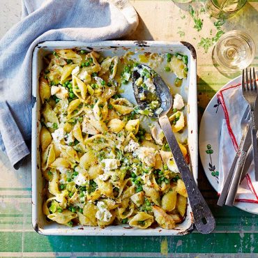 Pastaschotel met kip, prei & erwten
