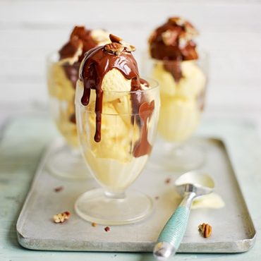 Vanille-ijs met choco-ahornsaus