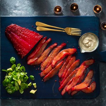 In rode biet gemarineerde zalm