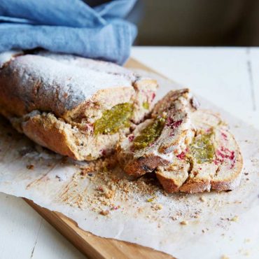Speltstol met pistachespijs en frambozen