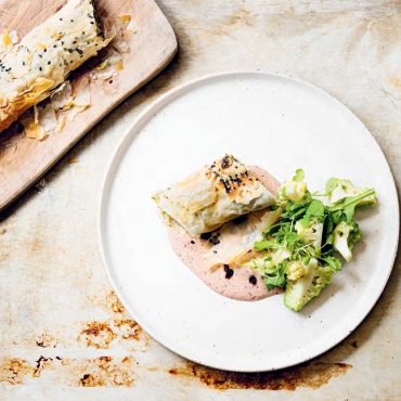 2. Leg twee plakken landham op elkaar, vul met de rucola en de kaascr.me. Rol stevig op en zet eventueel vast met een prikker.